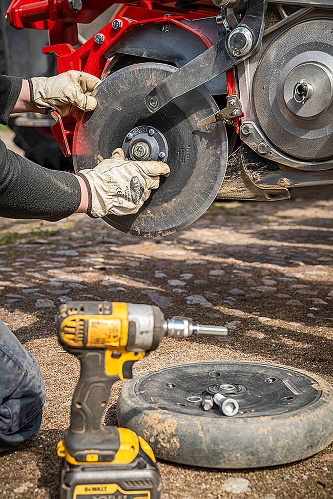 The 50mm high mulch seed coulters are available in different lengths and are easy to change. Rather than using roll pins, this is done with two screws per coulter. The cutting edges of the coulters are made with Widea steel, while the flanks are made of Hardox. The discs and gauge wheels can also be easily removed using an impact wrench. Thanks to removable shims between the discs, wear is quickly compensated for.