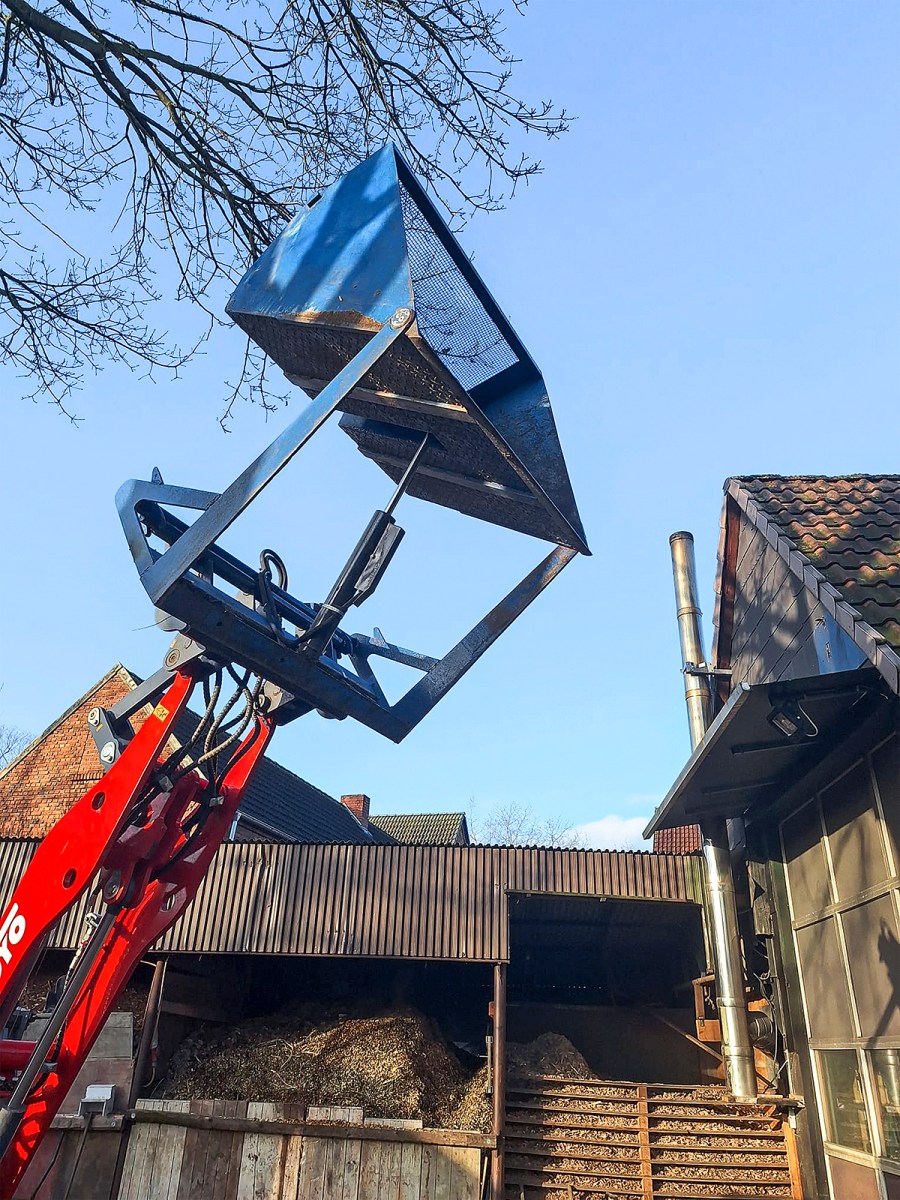 With a lift height of 3.20 metres and an unloading height of just 2.20 metres when the bucket is fully tipped, these are stats that make the loading of woodchip into a high-sided trailer a challenge … to say the least. That’s why I decided to build a lightweight high-tip bucket for light material that has an unloading height of almost 4.0 metres.