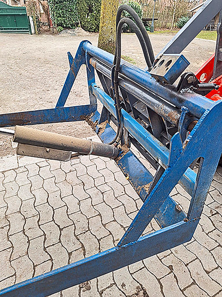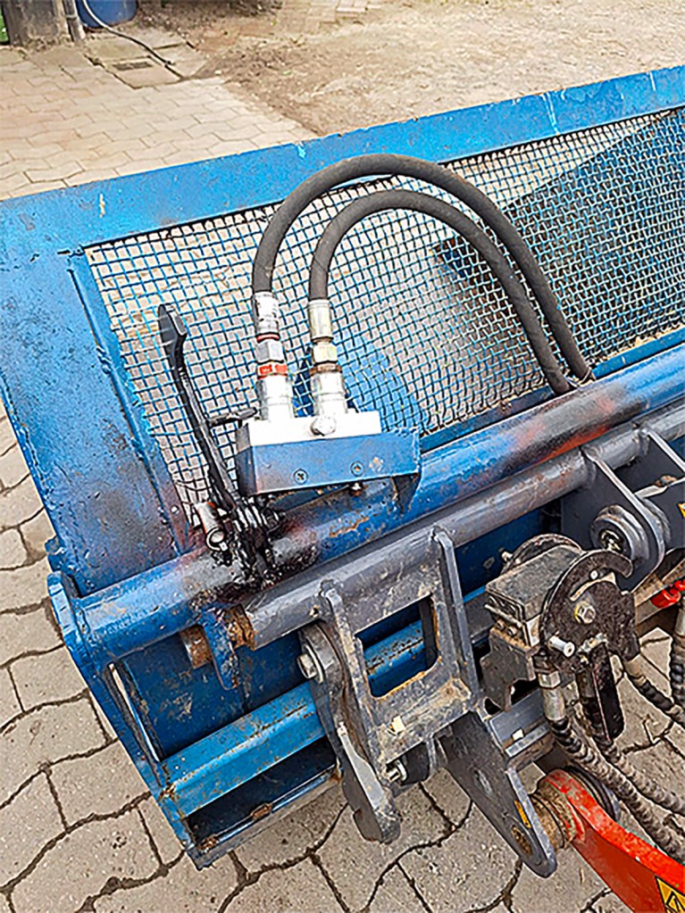 We regularly swap attachments. The loader has a hydraulic quick attach, but the quick-coupler for the loader auxiliary service was occasionally forgotten about. To prevent it getting damaged, I added a hook next to the coupler’s holder. This hook is folded up when the multi-coupler is removed, but, when the coupler is connected, the hook is folded down and latches onto the headstock, so you can’t drive away with the auxiliary hydraulics still connected. In this way, stretching or snapping the hoses is avoided.