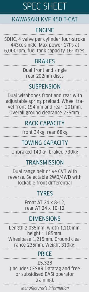 As to fuel consumption, the fuel injected Brute Force 450 did not ring any alarm bells. Although we no longer measure fuel use over a fixed test route, we do try and gauge how much petrol we put in against the ground covered. In this instance, Kawasaki supplied the little Brute with around a half of a tank of fuel showing on the digital display. During its time with us we used it mostly solo but also with the Logic trailer loaded with bales for our tow tests over steep terrain. The ATV left us still with a bar showing on the digital fuel gauge.