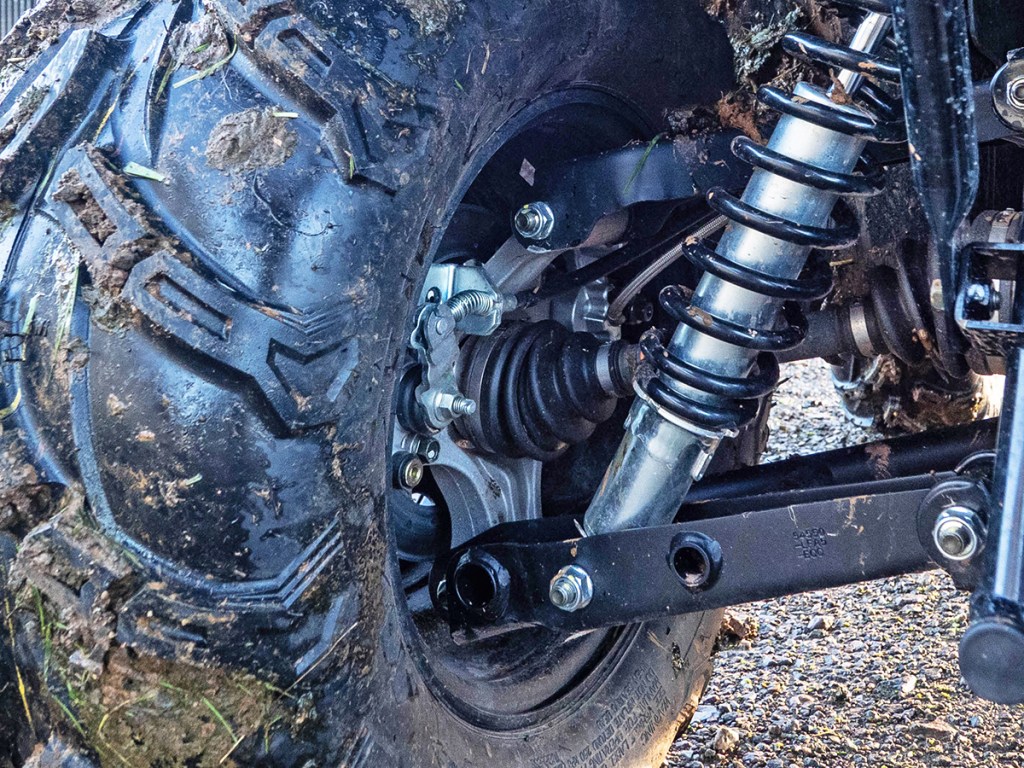 As to the ride, the engine did feel a little bit frantic and buzzy if pressed hard but at a more measured pace it was fine. As to comfort and stability over rough ground we had no complaints either at sensible speeds. Talking of speed, there is a selectable rev limiter fitted that will restrict the engine to a maximum 4,000 rpm. This is activated via a blue button marked with a tortoise but we found pressing it just made the ATV feel less peppy. The system also felt a bit crude in how it kept the revs down, the engine becoming less inclined to rev and a bit lumpy. We preferred to use the throttle to tame the revs.