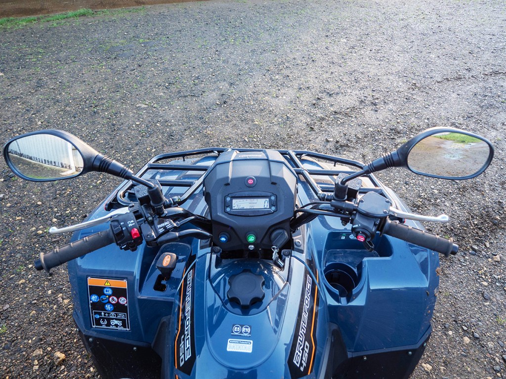 To meet compliance with EU regulations for use on road, the Brute force 450 has features to include a tow hook inside the front bumper, mirrors, horn, hazard lights, licence plate bracket and lamp plus a brake warning lamp above the instrument panel.