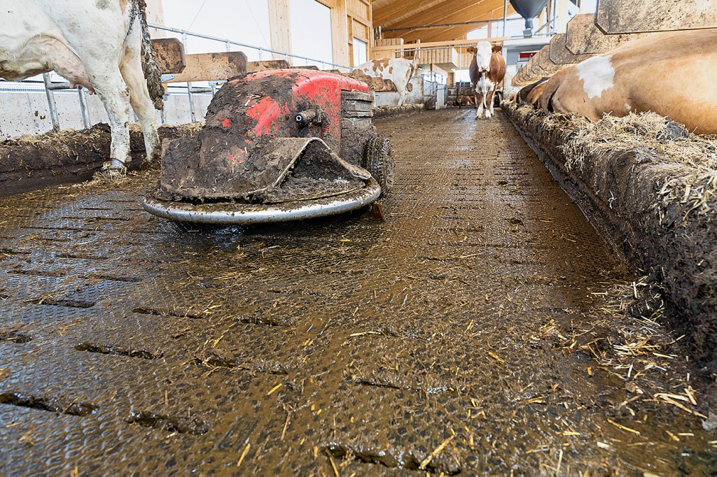 The first possible solution was to install a level floor with a scraper, but due to the sometime harsh winters in Bavaria this was quickly discounted. A milking robot in the middle of the barn would also have added to the cost and complexity of using a scraper, and the connecting cross ways would still need to be manually scraped.