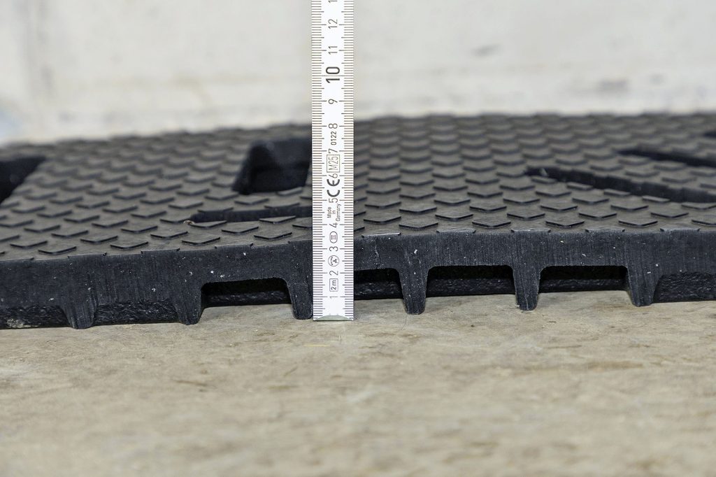 To create a seamless floor surface, the edges of the mat are cut out like a jigsaw, so they can link to their neighbour. Kraiburg has been using rubber anchors for securing its slat mats for over 20 years and sticks with the same fixing system here. These anchors are simply hammered in once the mats have been laid out in position.