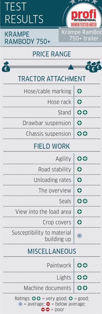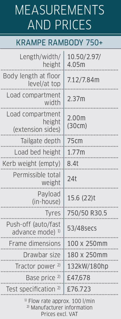 The technical payload of the 750+ is said to be 22t, but that partly depends on the type of material you’re hauling. We checked the unloading time — 48 seconds to push off a 20t load of silage, which is OK. Krampe has changed all the hose routing, because the scissor-like zigzag layout on the first trailers didn’t work properly. The hoses are now laid out in a straight line above the cylinders.