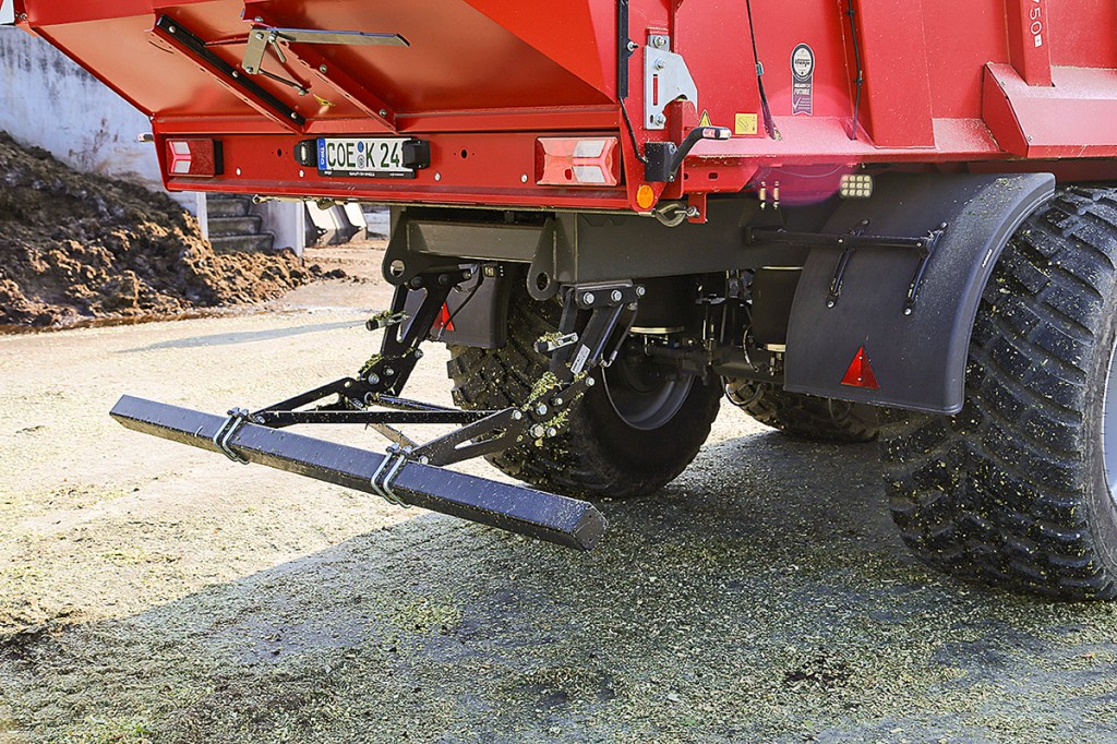 The trailer drawbar is cushioned by two silent blocks. You can play around with the drawbar height to match your tractor, and a K80 spoon is the standard coupling from the manufacturer.