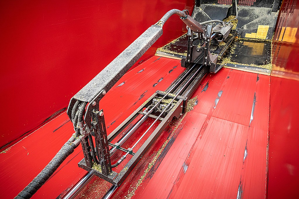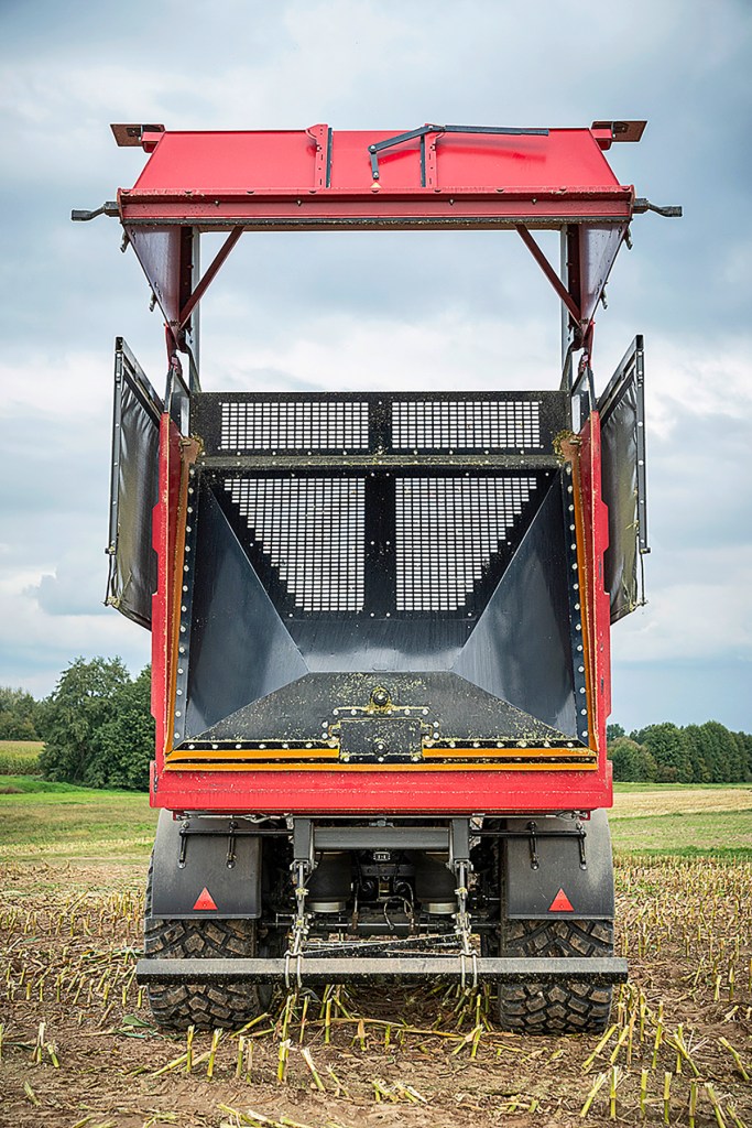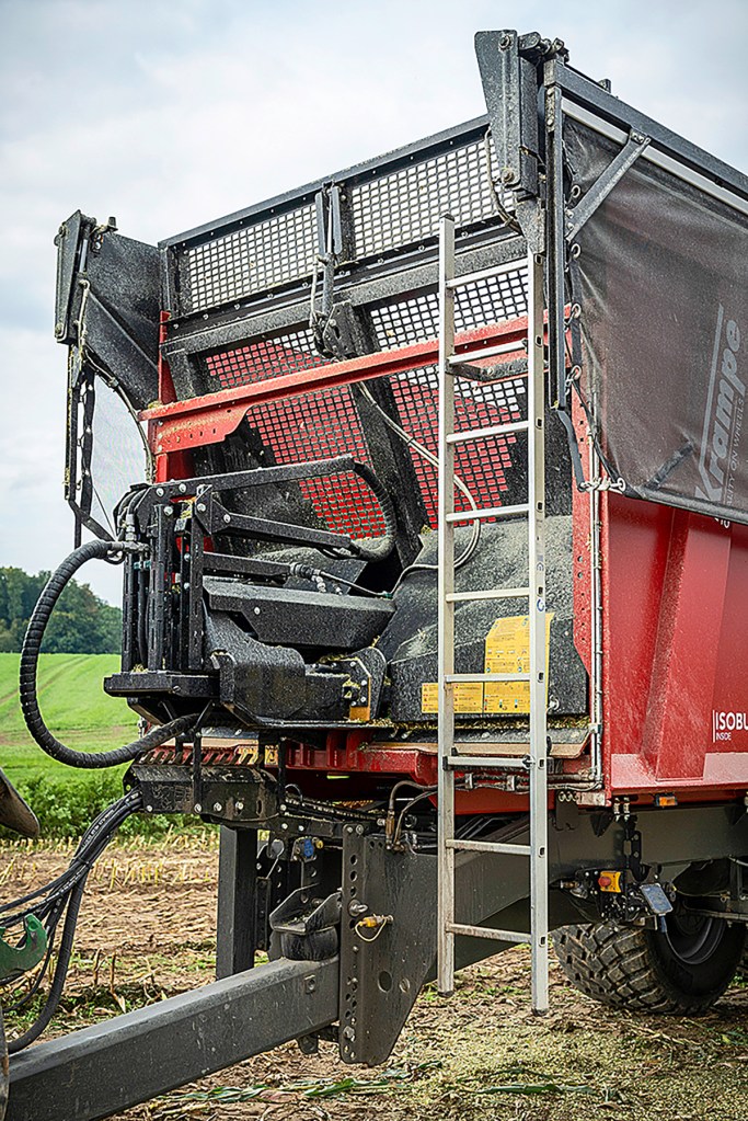 We really liked the very good visibility into the body: the holes in the headboard are big enough to see what’s going on in the trailer, yet small enough to prevent much maize from trickling through the holes. For smaller material, Krampe supplies Plexiglas panes that are fastened onto the push plate. The plate is sealed all around with adjustable rubber strips, and there is an adjustable flap at the top of headboard, which is controlled from the terminal using the load-sensing system.