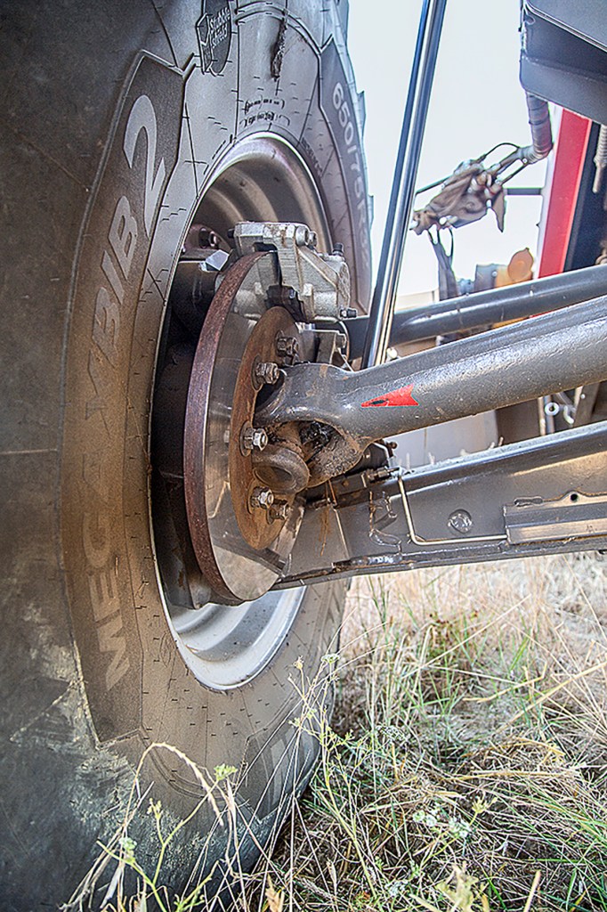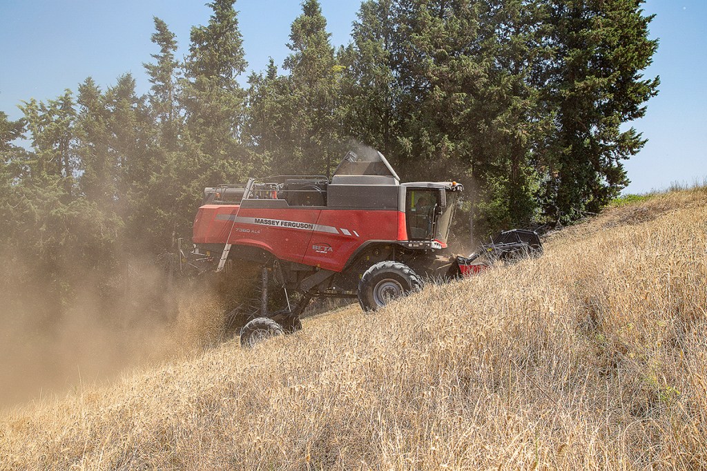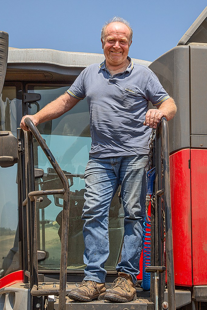 Looking down at the 5.40m header you get a glimpse of the reality. When the auger is struggling to feed the dry durum wheat (yielding 5.0t/ha ) ‘up’ to the elevator, a discreet beep warns the operator that the chassis has almost reached its end position. We couldn’t completely grasp the steepness of the slope. It was only when we got out of the cab that we realised what the system was capable of achieving. Pierangelo grinned: “Yes, we have to keep a cool head, even at temperatures of 38°C.”