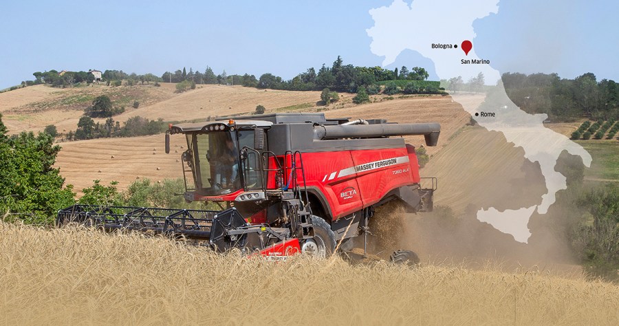 Well, the steep hills of the region mean that farmers can’t use the likes of a big Lexion, Ideal, CR or X9. The rolling countryside in the Forli-Cesena region, halfway between Bologna and Rimini up in the north of the country, is well suited to growing wine and, thanks to the mild climate, it is also ideal for growing fruit and vegetables. But there are also livestock and arable farmers in the area taking on the tough challenge of working the challenging terrain.