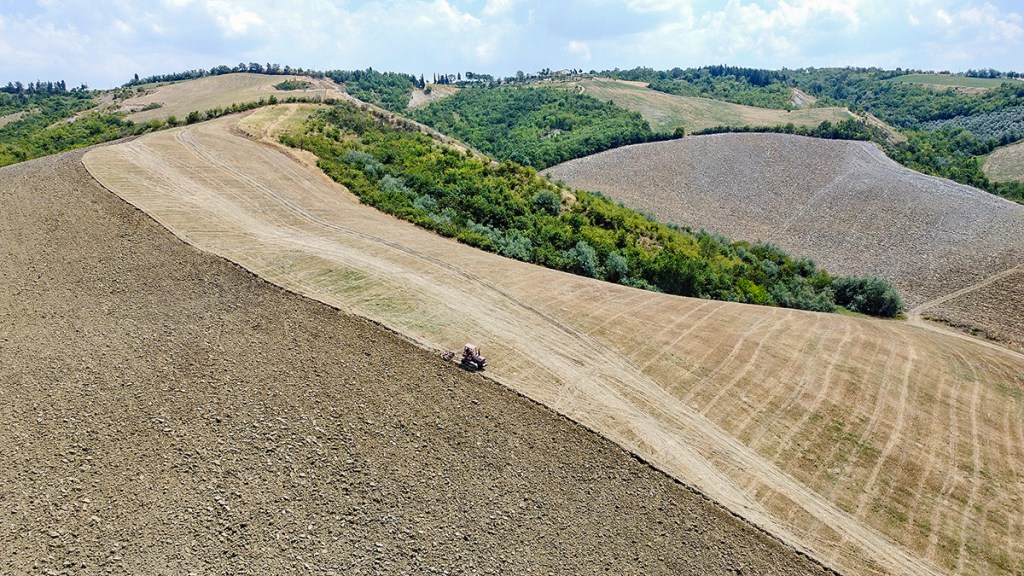 We take the passenger seat as Pierangelo opens up the next field. It doesn’t just slope in one direction, so you can’t simply drive around the perimeter of the field, not even with a self-levelling system.