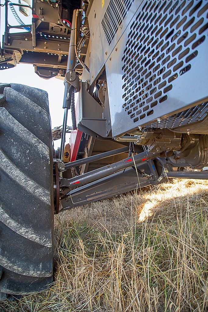 Lateral levelling is taken care of by a pair of hydraulic cylinders on the pivoting front axle. This configuration allows the AL4 to pivot sideways, compensating for gradients of up to 38%. Longitudinal levelling is also achieved with two hydraulic cylinders; these are linked to the rear parallelogram on the back axle. The parallelogram is connected to the machine frame farther to the front and to the swivel bearing on the combine’s rear axle.