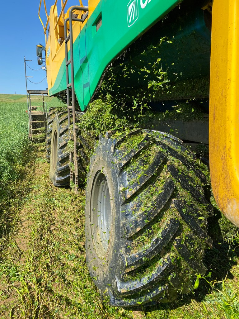 I know from several seasons experience driving a pea harvester in Spain that the mound of soil left pushed up as the rear wheels sink in soft conditions makes it extremely difficult to harvest the first row of peas on the next pass without taking in some soil. The crab steer mode, and the larger 710/60 R30 tyres, means this is no longer an issue and the larger tyres also help to reduce the footprint.
