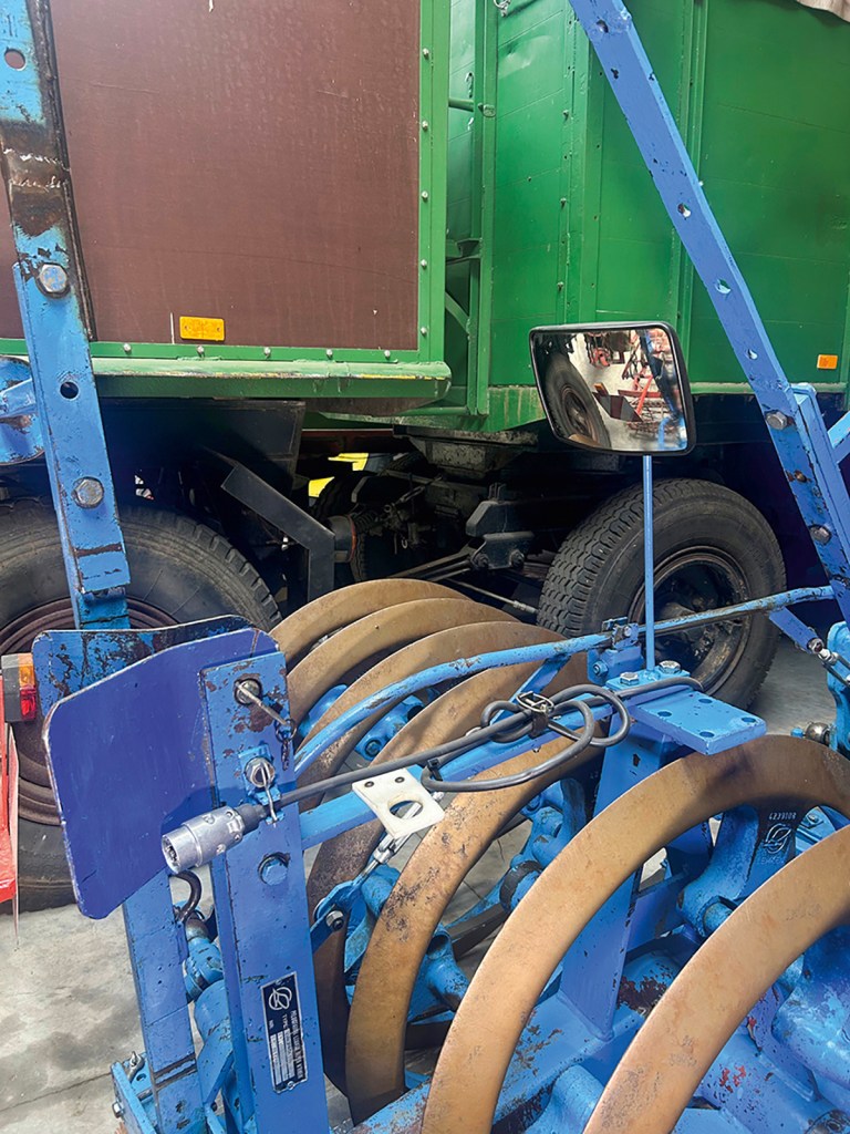 This reader fitted a mirror to his press to make coupling to the front weight easier. This allows him to keep an eye on everything from the tractor cab. A catcher pocket — two metal plates to help guide in the coupler — means you don’t have to be lined up perfectly. This makes it quicker to attach the press both on the way to and from the field.