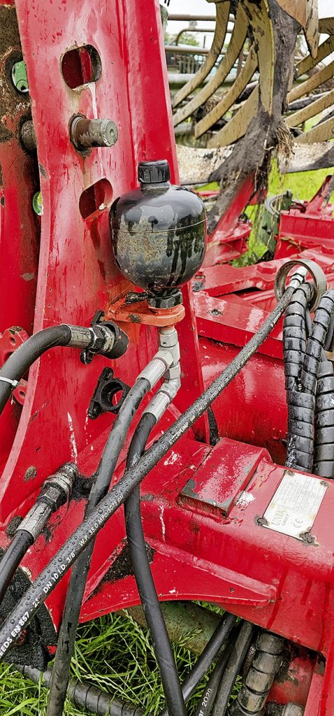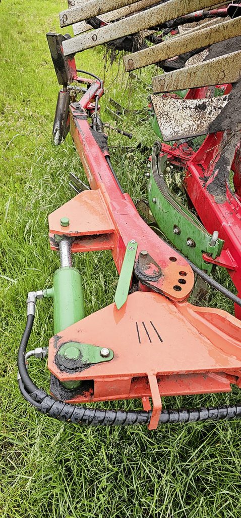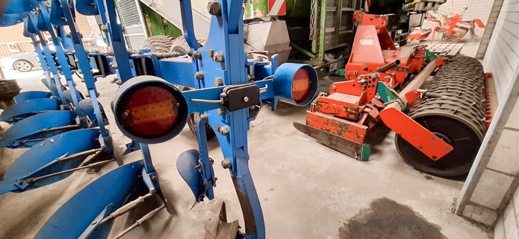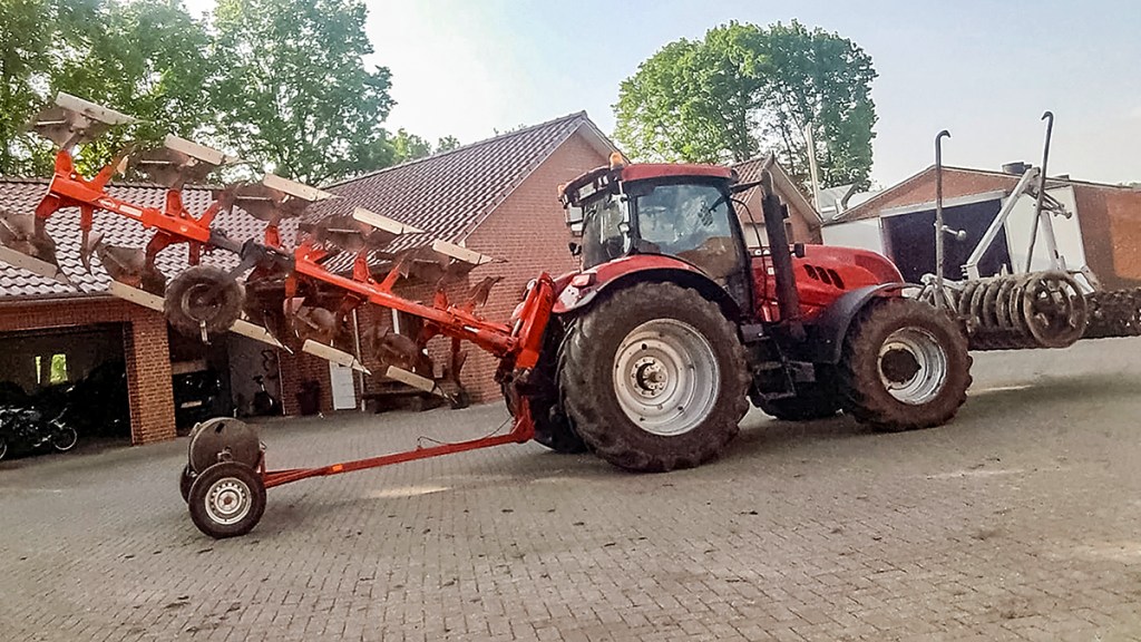 Marc Kiesbye has made some practical modifications to his plough. The press arm is now hydraulically adjustable, eliminating the need to dismount for every obstacle or road journey. This also allowed him to incorporate a larger pivot range for the arm so it can reach out more to catch the press if it is a little farther away. A small scale with an arrow shows the current position. In addition, a new nitrogen accumulator on the press arm ensures shocks and knocks are absorbed, reducing stress on the frame.