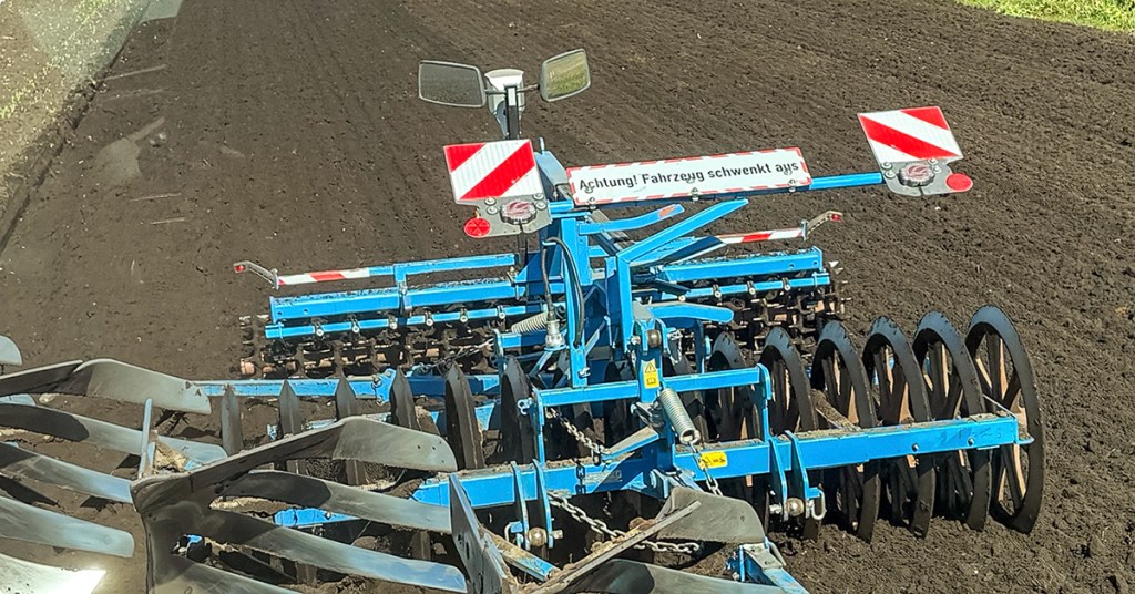 Daniel Rosenbrock equipped his Lemken Juwel 8i with additional safety features. A ‘Vehicle swings out’ sign was added to the light bar, which can be easily removed and stored on the press using a cotter pin. A mirror system, marker lights and selectable warning lights are fitted to the rear of the press. The electric connection is made via a Suzie cable that connects the seven-pin socket on the front linkage to a swivel plug on the press.