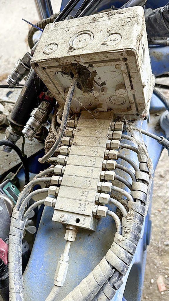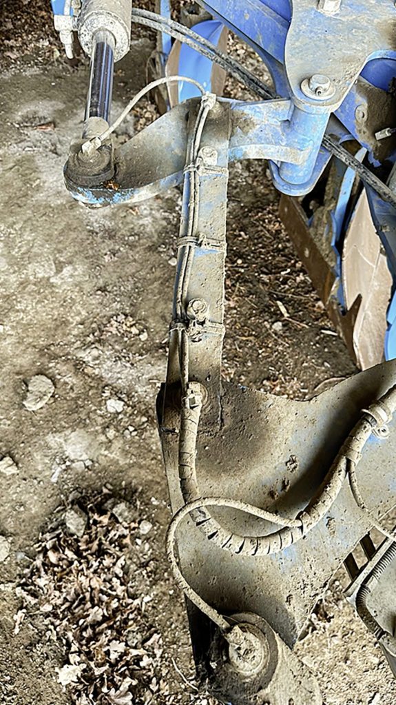 This reader attached a bracket for a warning panel and light to the rear of the plough’s beam. The rear light has a flashing indicator to signal a turn is about to be made — but not the direction. It doesn’t matter which way over the plough is turned, as the panel is always correctly orientated. The wiring was routed along the frame, protected by the hydraulic pipes and placed in the middle of the hoses at the turnover.