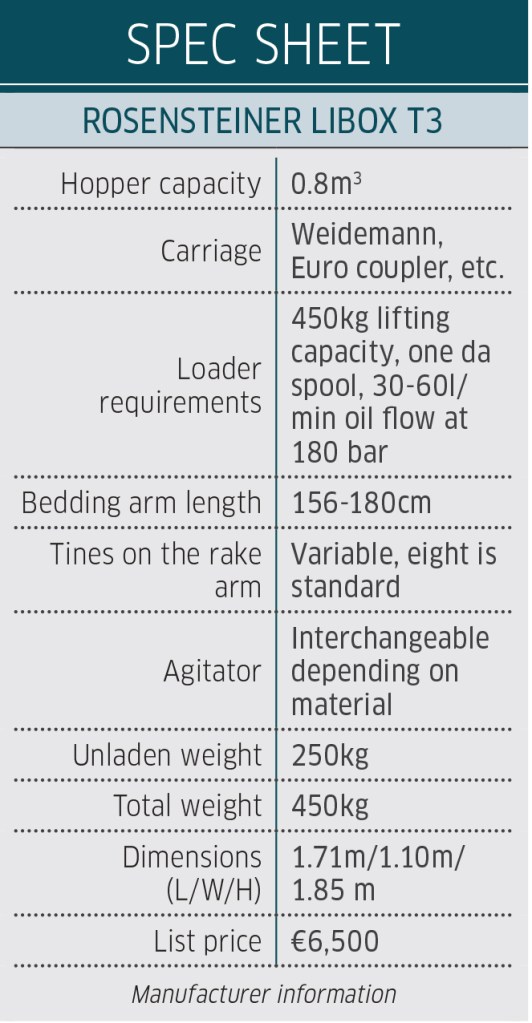 Rosensteiner is currently offering the Libox T3 through dealers for €6,500 or around £5,650 plus the cost of shipping. When delivered, the bedding machine is largely pre-assembled; just the frame still needs to be fitted by the farmer and adjusted to the width of the yard loader or handler, which Rosensteiner says normally takes less than half an hour.