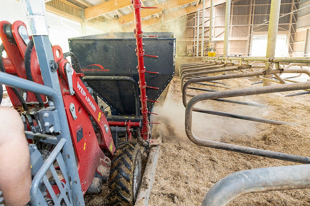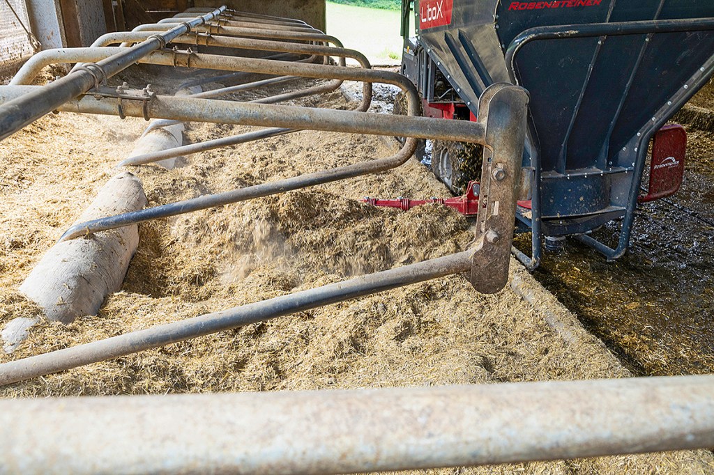 Using milled straw and applying it at walking pace, the Libox spread 1kg of straw per cubicle on the one pass. When asked about bedding material, Friedrich tells us that thanks to the integrated agitator, bedding with long straw works just as well as with milled straw.