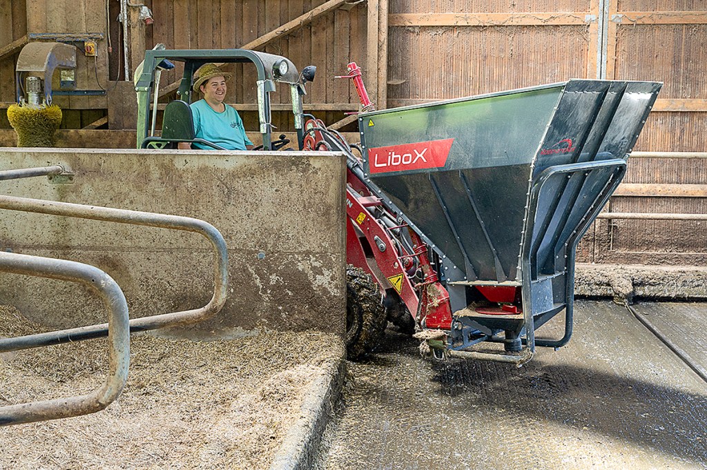 The dairy farm’s bedding material consists of short chopped straw. At the time of our visit, however, they were spreading milled straw from Italy which generated a lot of dust. Friedrich said that their own straw produced far less dust. The hopper is filled by tipping the Libox and driving into the straw bale.