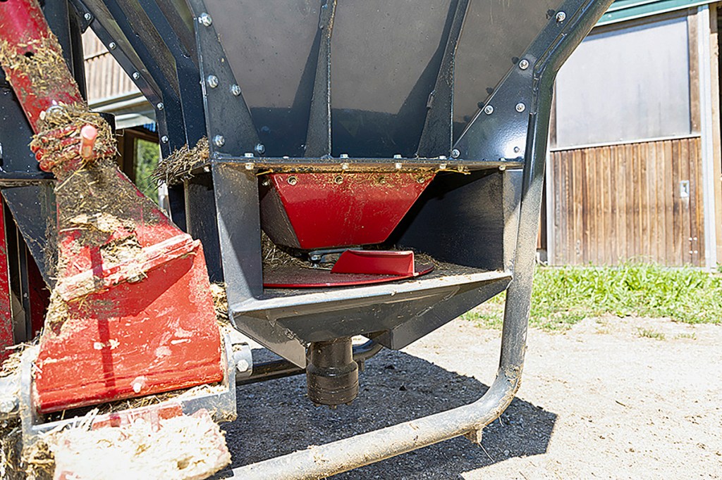 The spreader’s throw reaches up to 2.50m, depending on the setting of the vanes, the loader’s hydraulic output and the working height of the bedder. The application rate itself can be altered by adjusting a slider on the outlet after undoing two bolts on each slider.