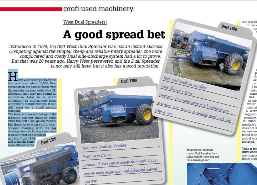 Harry West’s Shropshire works has produced about 5,000 Dual Spreaders in the past 20 years, with the majority staying within the UK. Although that may not sound an impressive total in a world dominated by increasingly large equipment manufacturers, it is a tidy total for a small private company.