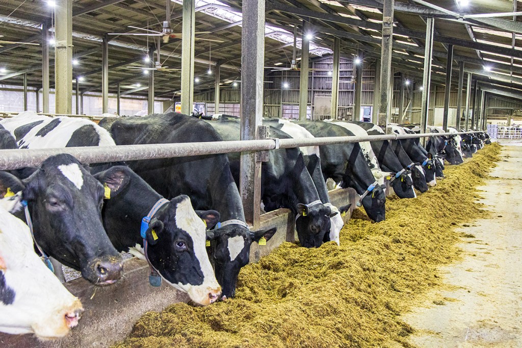 The cows are housed year-round and are fed TMR with supplemental meal in the parlour; milking is three times per day and feeding is done once, with feed frequently pushed up. Youngstock and followers are reared on the farm.