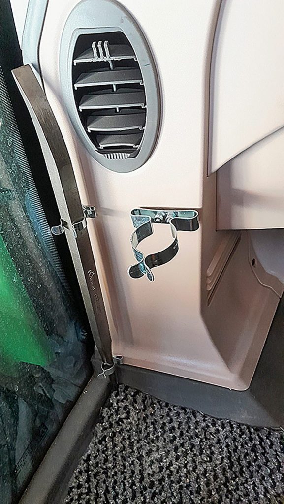 This reader has attached large clips to the cab trim of his Fendt tractor. He uses these clips to store a hammer and a spike. This means that the tools you often need are stored within easy reach in the entrance area and not on the floor where they turn into hazardous projectiles when braking sharply.