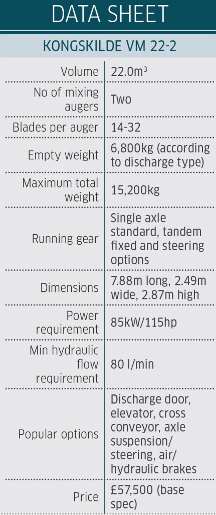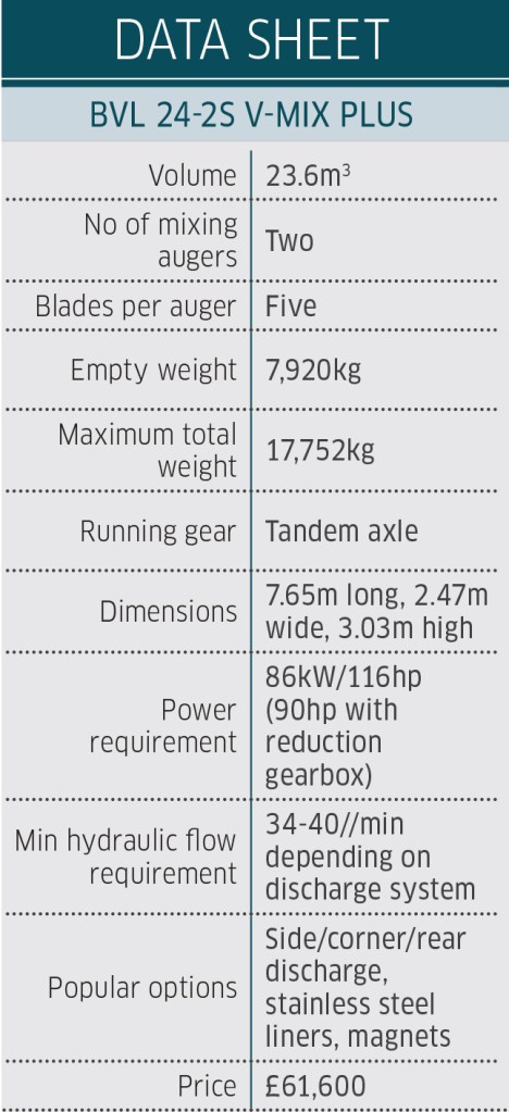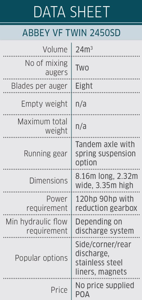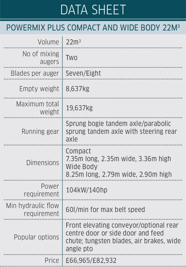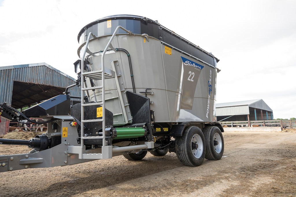 Shelbourne Reynolds’ Powermix range of vertical diet feeders includes two models in the 22m3 size, featuring a curved tub designed to speed up bale processing and mixing and said to be capable of mixing at least 10 tonnes of feed per batch, depending on dry matter.