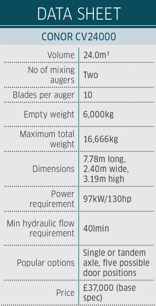 The CB24000 is the flagship model in Conor’s single and twin rotor range, with discharge doors positioned at the corners, on the trajectory of the augers rather than on the side. It features an independent reinforced chassis for stability and slim drawbar for easier manoeuvring in traditional buildings. Hardox flights option. Standard spec is twin feed-out doors, but recent updates include options of a fully sealed rubber belt conveyor and slide and tilt conveyor with HD rubber belt.