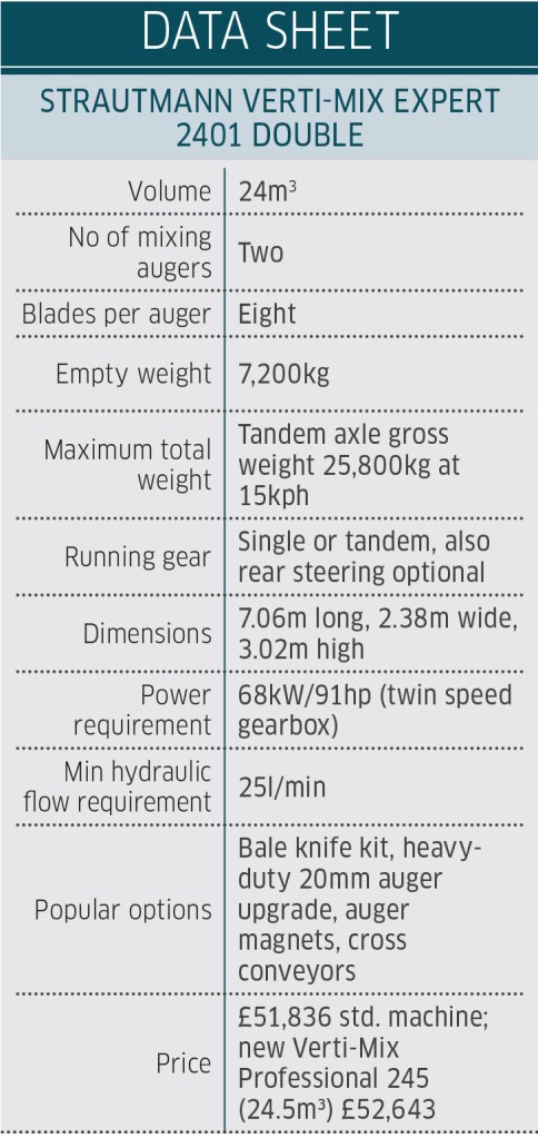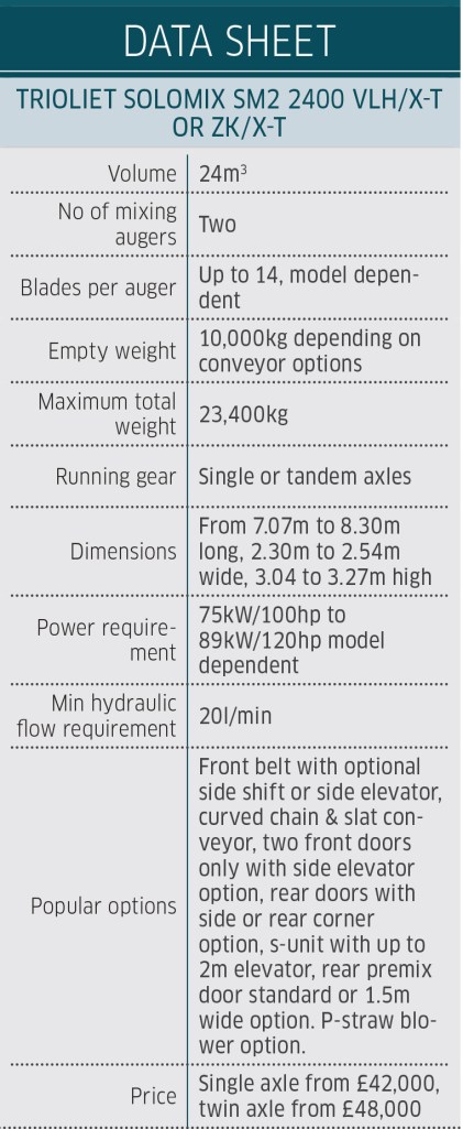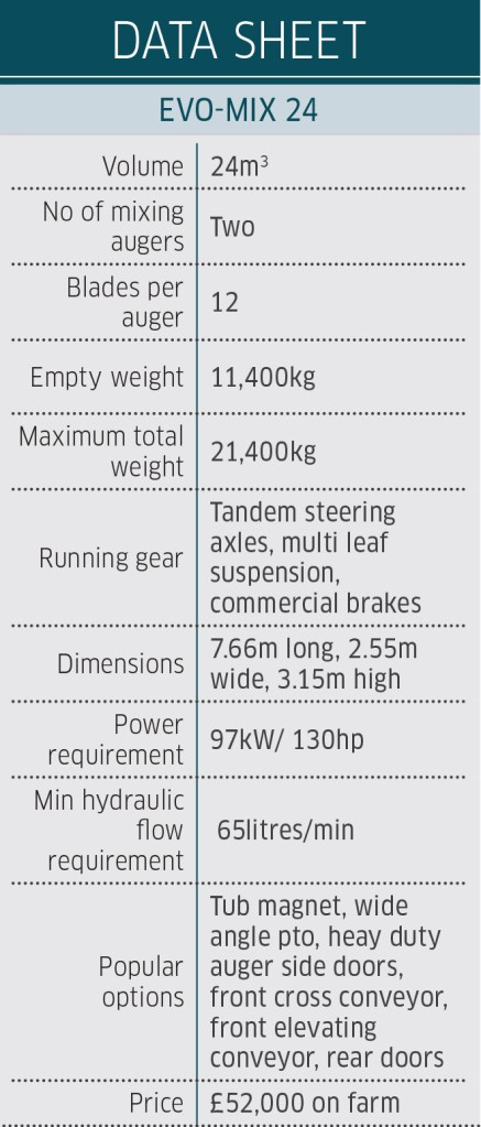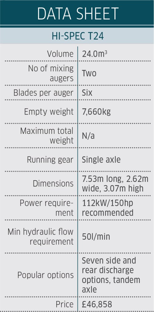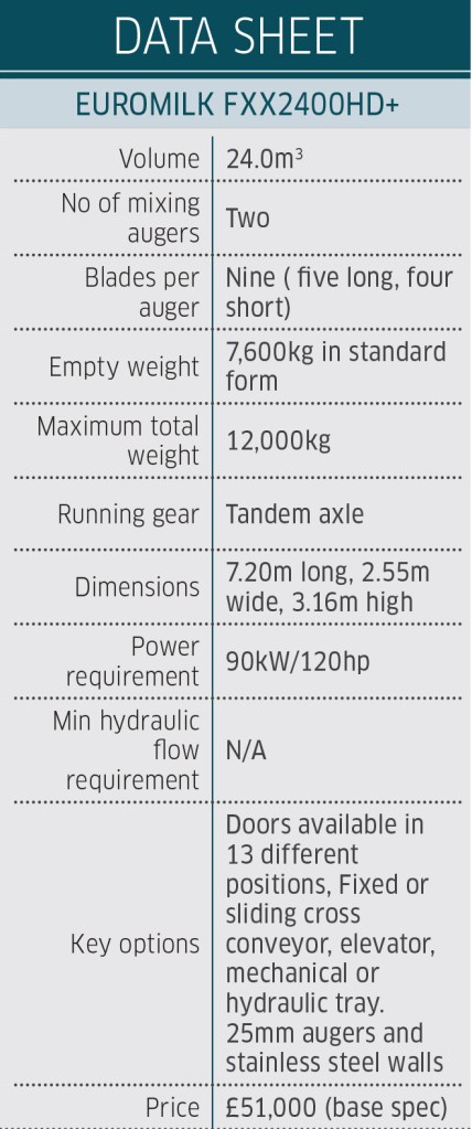 Supplied in the UK by HF Evans, the Polish-made Euromilk Rino FXX 2400HD+ comes at the lower end of a range that extends to 32m3. Key features include a reinforced frame structure, a wide hopper, 20mm thick augers and floor, plus 8mm walls and inspection ports at the front of the hopper. Optionally, the machine can be equipped with a steering axle with a reverse lock.