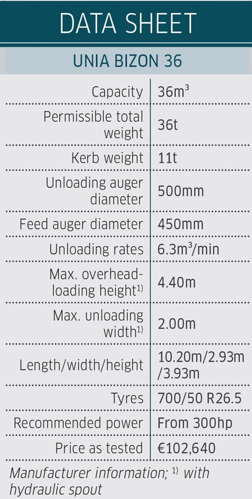 - Unia’s Bizon 36 holds 27t of wheat and unloads at a rate of 1.4t/sec.