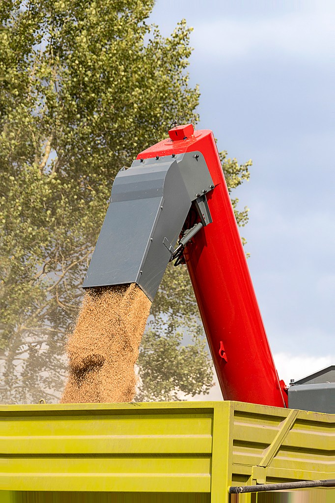 Unia quotes a maximum unloading rate of about 500 tonnes per hour, which means that in theory you can empty the bin in 3.5 minutes. We measured this in the field and found the 500mm auger spewed out around 7.5 tonnes of wheat per minute with the gates over the trough augers half shut. With the optional hydraulic spout (€1,400), we could better target where the grain was landing, which overcomes the issue of not being able change the angle of the auger.