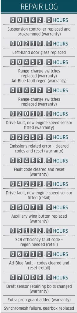 A glance at the repair log shows this tractor has needed a few on-farm fixes in the last four year, mostly with electrical issues that have been swiftly rectified. On more than one occasion, transmission switches have plagued the downshifting, and a total drive failure was traced back to an engine speed sensor fault.
