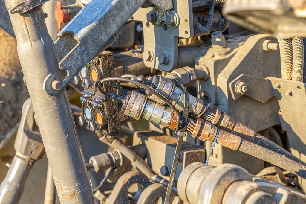 This HiTech model came with only two mechanical rear spools, and could have done with at least one more to run some of the kit in use at the farm. The answer was to run a pair of pipes from the loader’s hydraulic services block to the back of the tractor. This way, one of the loader’s functions can be used when a third supply is required.