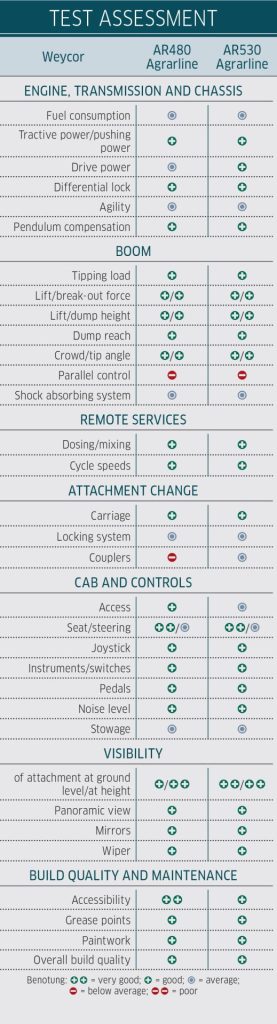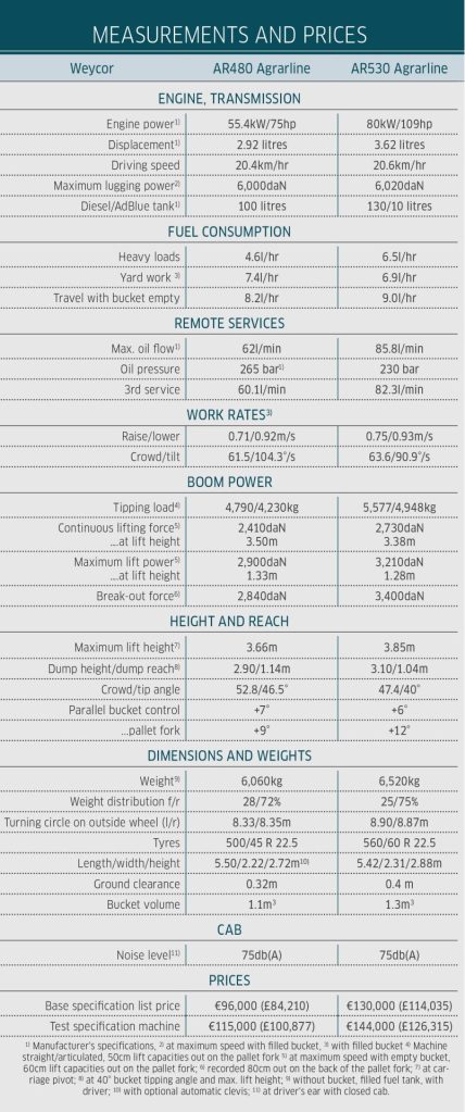 The North German loader maker specifies a tipping load of 3,481kg for the AR480 when fully articulated, and 4,070kg for the AR530. We measured the continuous lifting force and found there was a difference of under 300daN (AR480 = 2,410daN, the AR530 = 2,730daN). There was a bigger difference in the breakout force.
