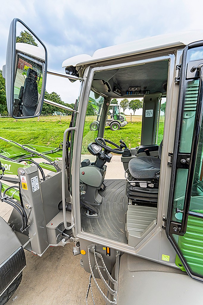 The one-piece doors on both sides can swing open 180⁰ and be pinned back open, and the release is easy to reach from the seat. The optional, and recommended, Grammer air seat offers very good comfort.