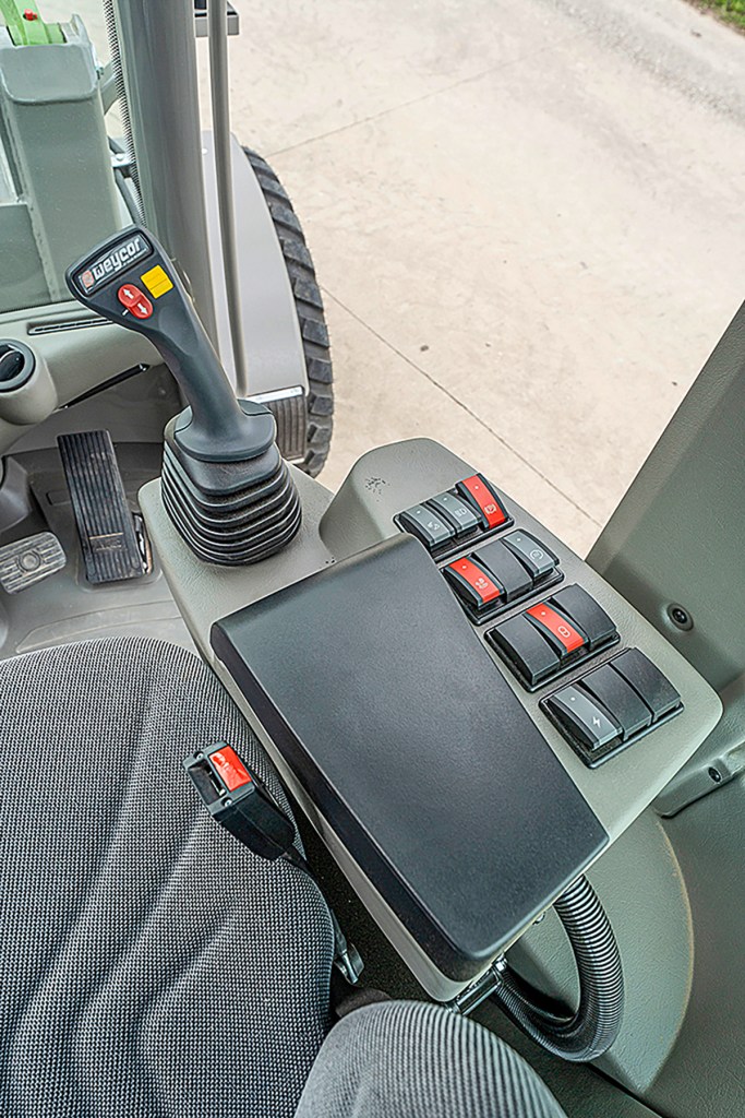 The joystick is kept simple and works via a hydraulic pilot control — mixing and control of the functions is fine on both machines. There is an optional joystick with an extra rocker switch for the fourth service. You can’t adjust the sensitivity of the joystick. A decal clarifies the controls such as the button on the back for the effective 100% diff lock.