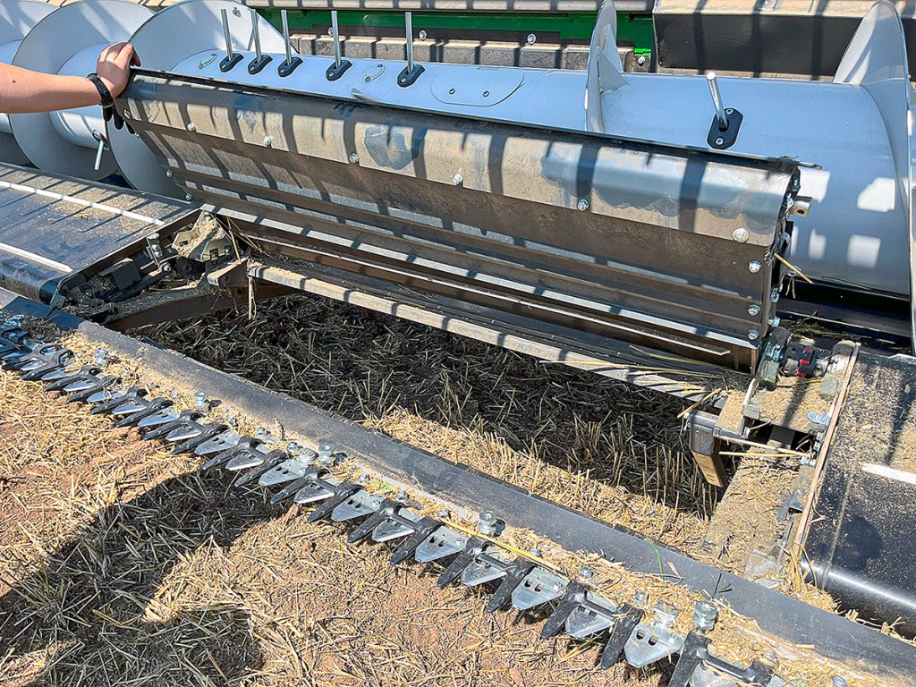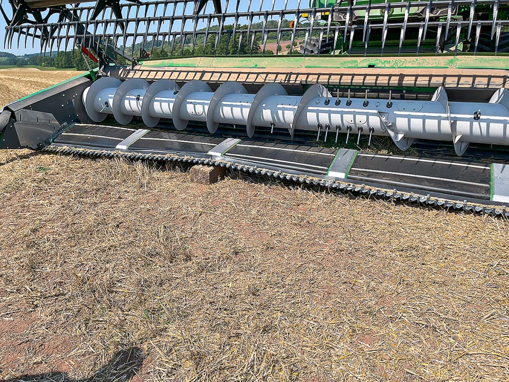 The cutterbar is sourced from Schumacher. On the 7.60m wide header, this is driven from just one side, whereas, on the wider 9.15m and 10.70m models, the knife is powered from both sides. The knives are synchronised and overlap in the middle.