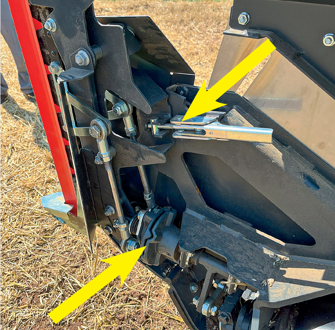 The Schumacher Easycut II System features roller-guide reciprocating knives. The grain lifters are attached to the fingers without any tools. Zürn says the Premium Flow Flex is currently the only flex header on the market with these new grain lifters. A height indicator on either end of the header shows the current position of the cutterbar. The operator can adjust the Flex float pressure hydraulically from the cab and even set the header to rigid mode.